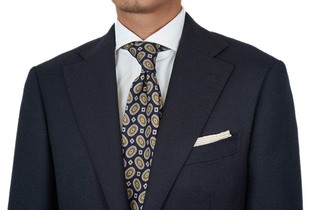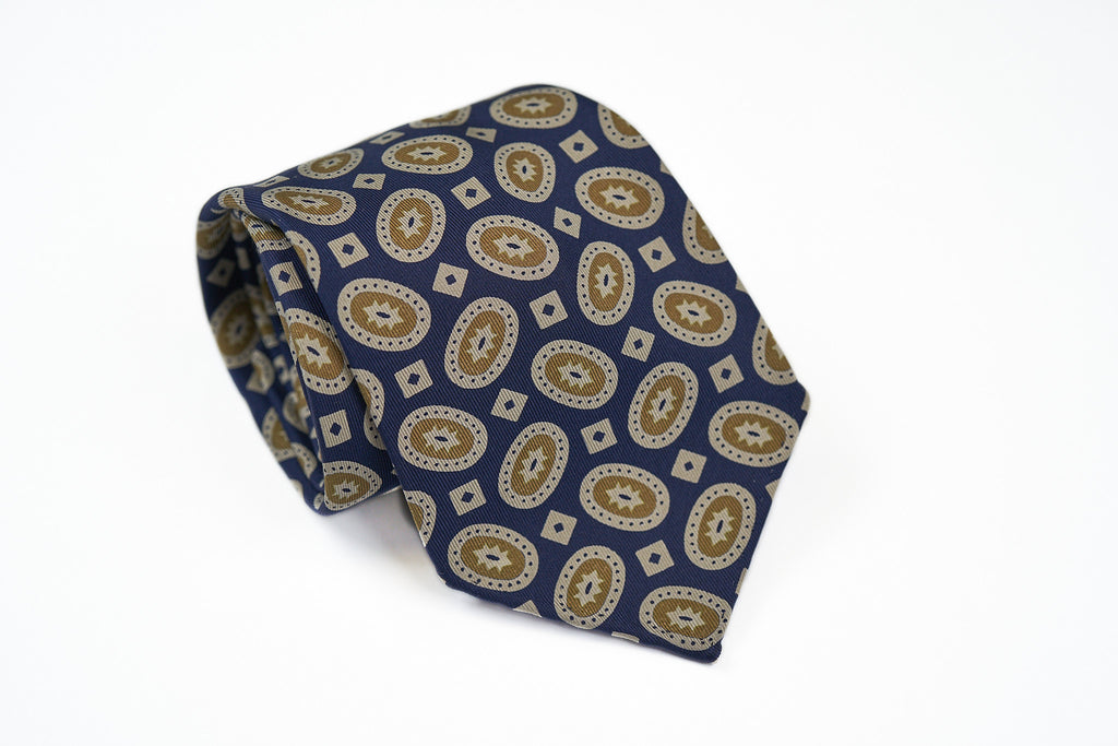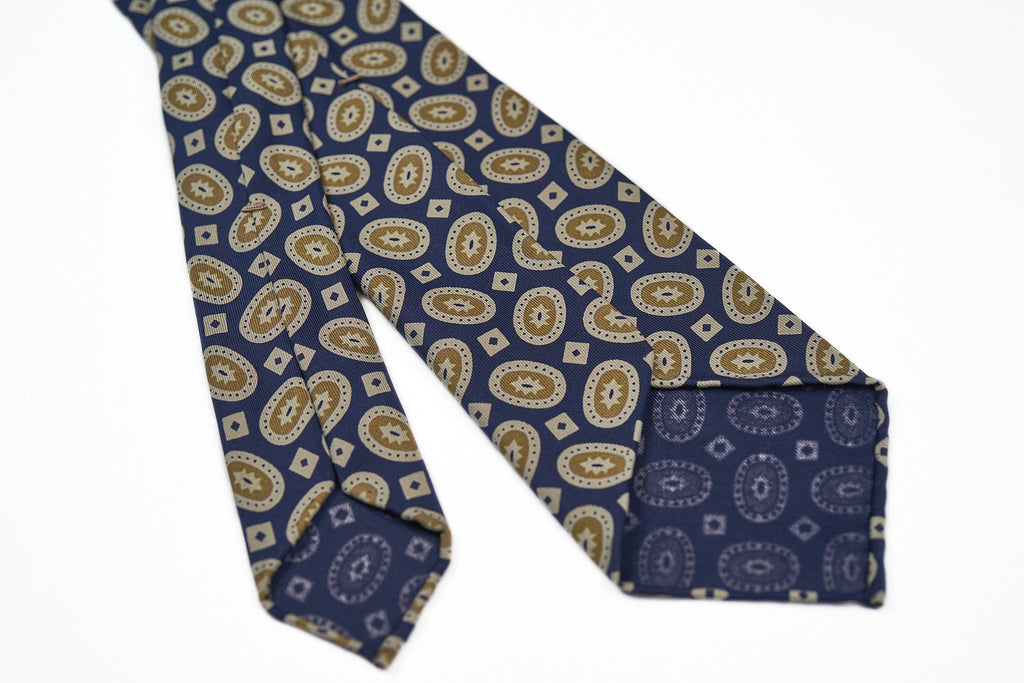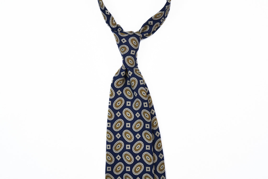 Made of 36oz hand printed silk from Macclesfield, this lightly lined six fold tie has a soft and chalky madder finish which gives it a supple and drape feel. The oval prints instantly reminded us of a cut kiwi! This version comes in a rich blue ground with gold/green and cream tones.