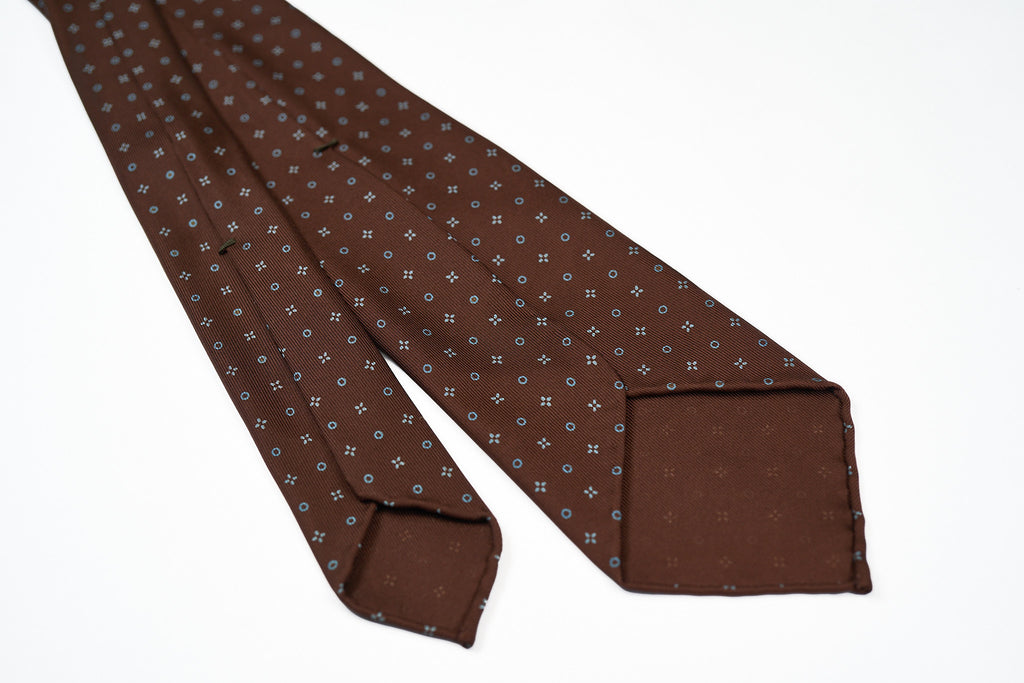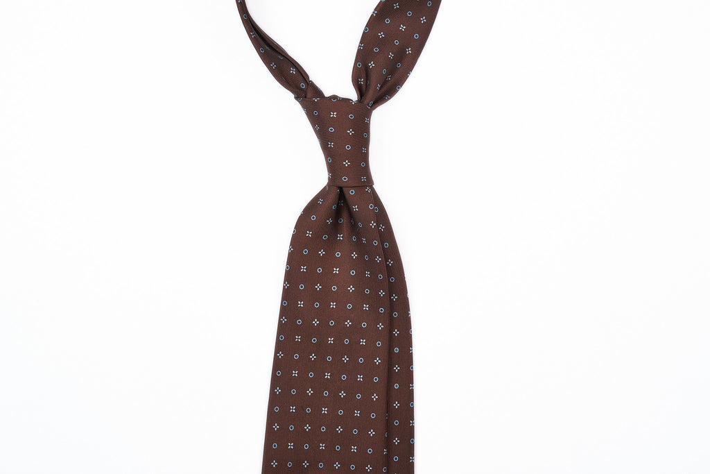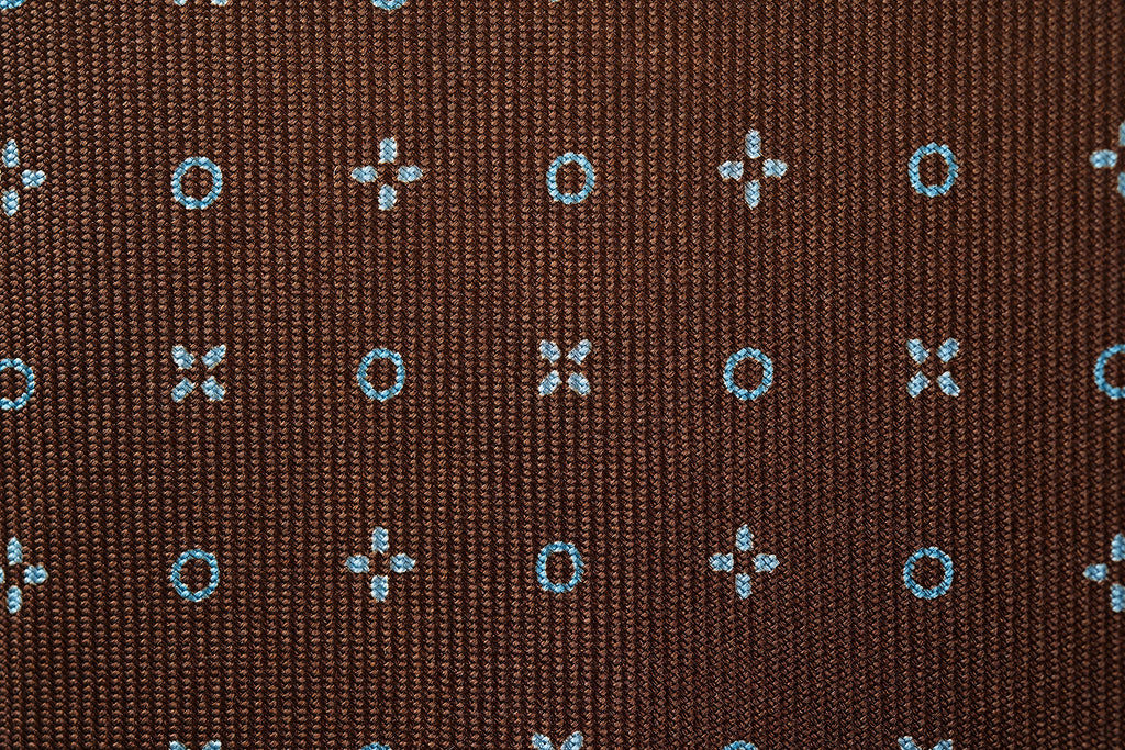 Made of 36oz printed silk from Macclesfield, this lightly lined six-fold tie is supple and lively, with an unmistakable dry and crunchy character. This one comes in a winning brown-blue combination, with a simple and elegant geometric design.