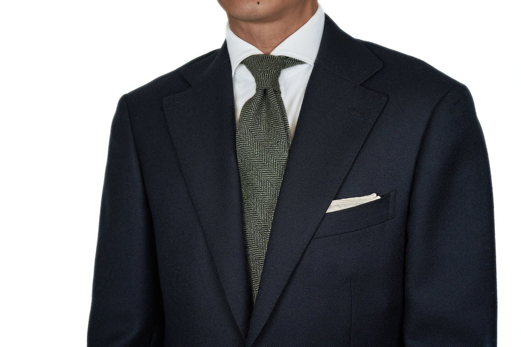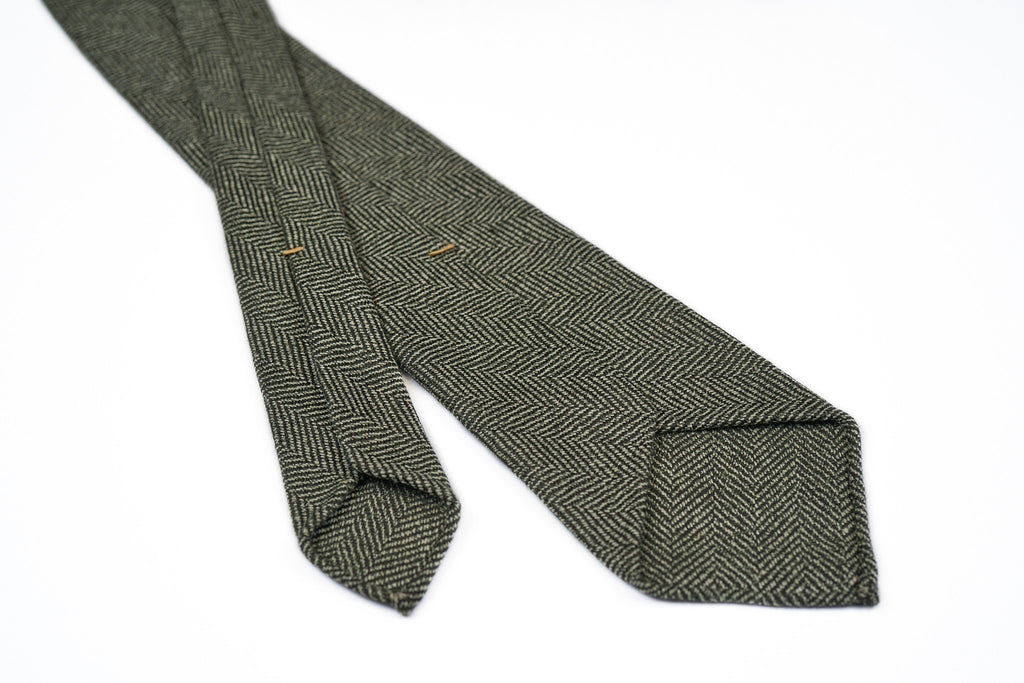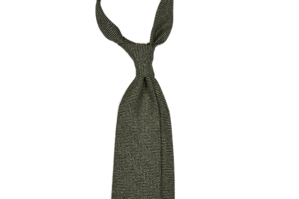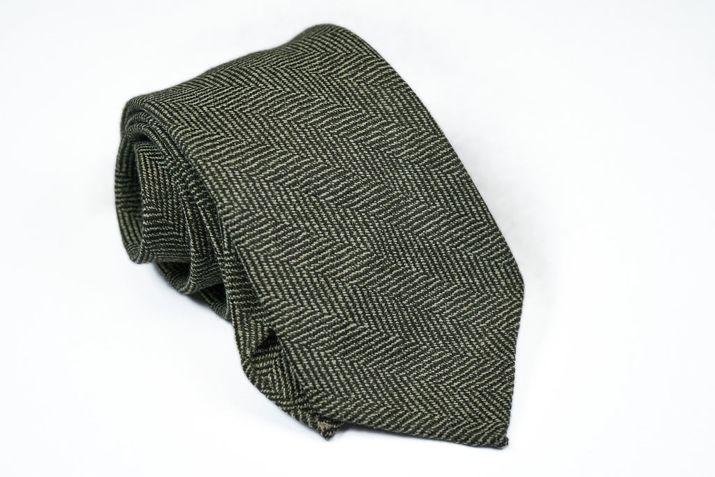 Made of a wool/silk/linen blend woven in Huddersfield, England, this lightly lined four-fold necktie has a dry, soft hand with a great texture. The classic herringbone design comes in a rich green-cream tones that reminds us of matcha. Ideal for year-round use.