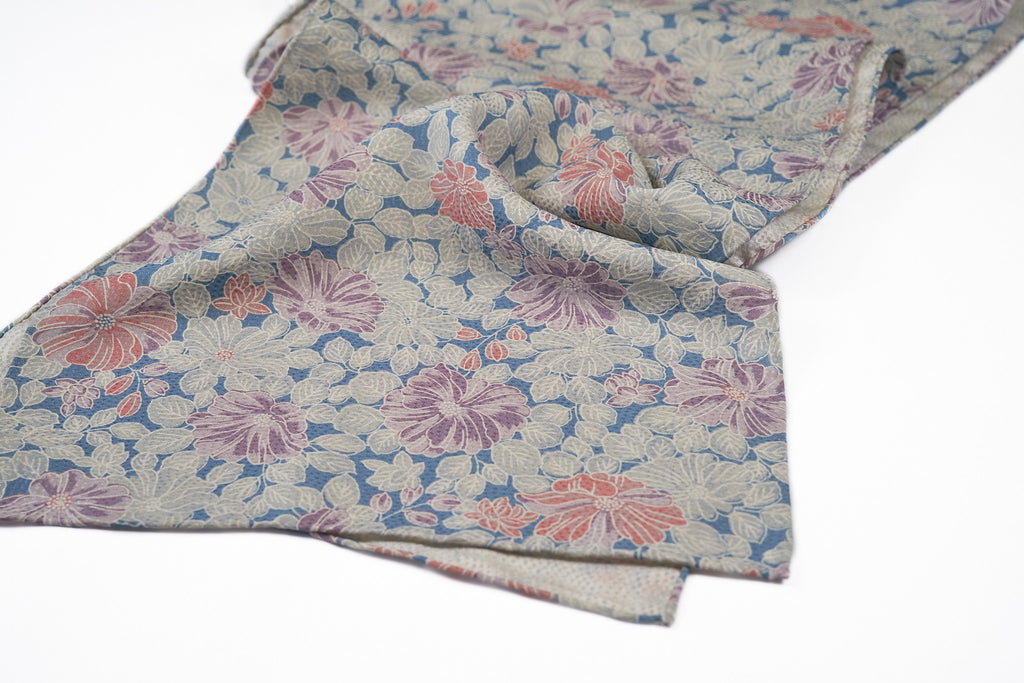 Made of vintage kimono silk, this light blue scarf features a classic leaf and flower design, printed on a woven silk ground with a subtle small diamond weave. The fabric is crisp, bouncy, and densely woven, making it a great choice for a scarf when it gets cooler. An excellent choice for fairer complexions!
