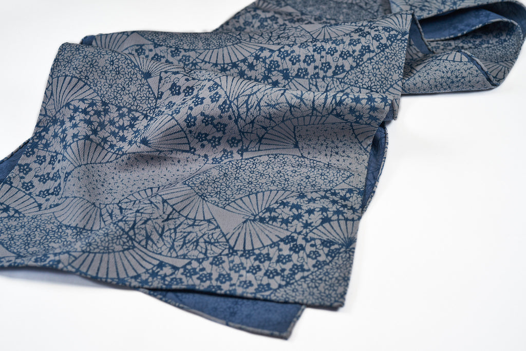 Made of vintage kimono silk, this tonal blue scarf features a mix of traditional Japanese motifs. The fabric is crisp, bouncy, and densely woven, making it a great choice for a scarf when it gets cooler. Works absolutely perfect with navy!