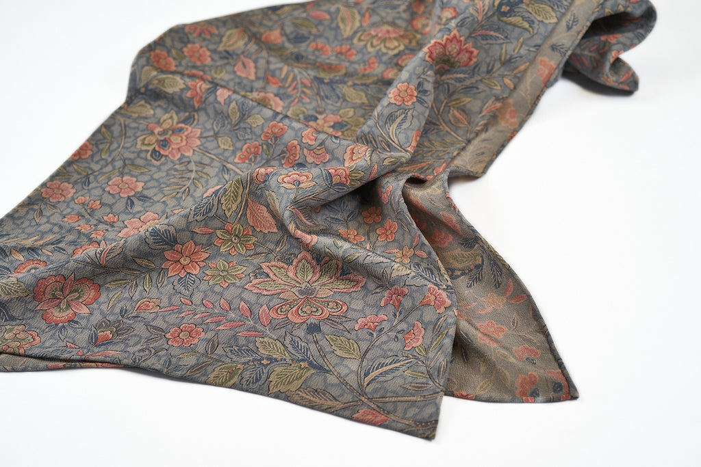 Made of vintage kimono silk, this soft blue scarf features shades of pink and green. The classic tango chirimen (crepe) silk has a lovely textured feel, and will soften with use to become a truly heirloom piece. Pair it with anything from an olive field jacket to a navy sport coat!