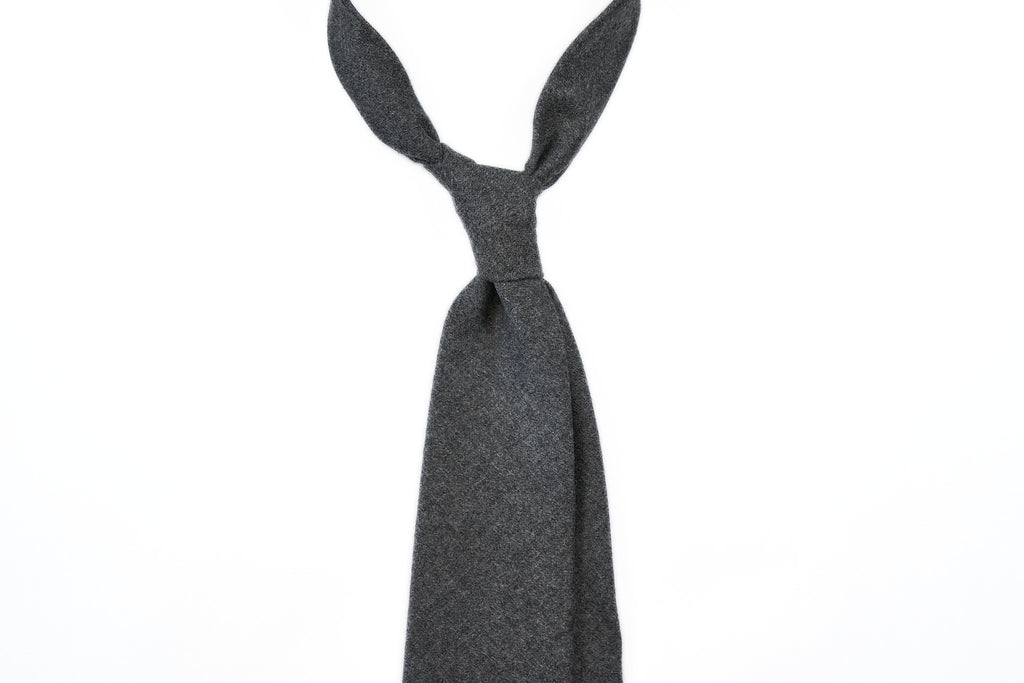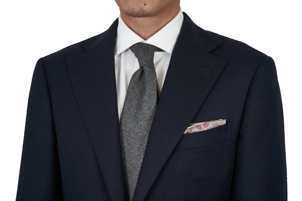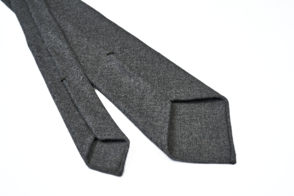 Made of unique blend of alpaca(!), wool and cashmere woven in England, this flannel fabric has a soft yet sturdy brushed finish. The rich mid grey melange shades add some visual interest, making this textured tie a simple but elegant and versatile.
