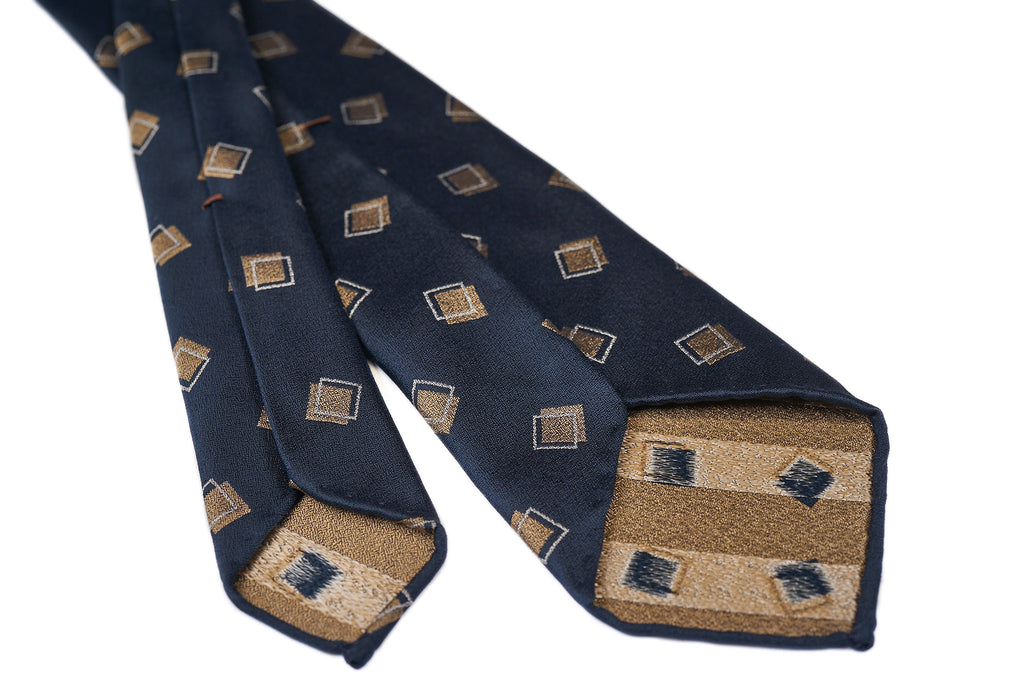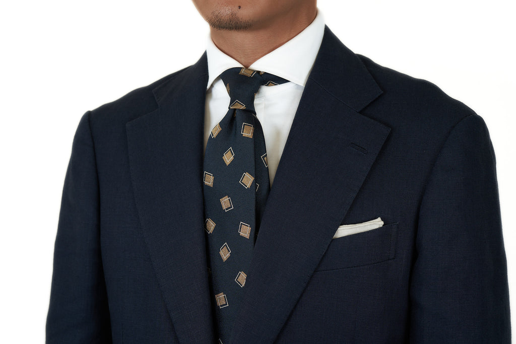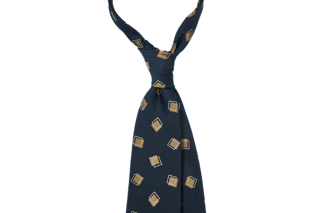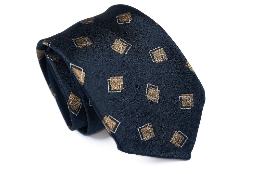 Made of pure woven silk in Japan, this jacquard silk necktie features intricate geometric designs on a rich crystal weave ground. The large offset squares are placed generously apart, which impart an understated elegance to this tie.