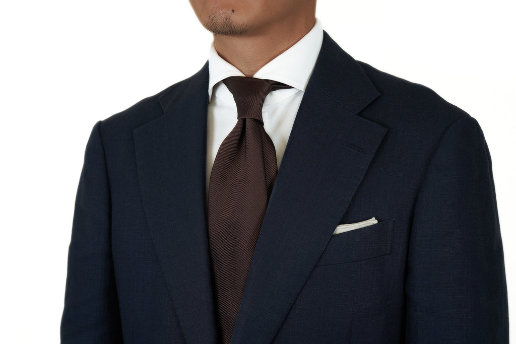 Made of pure woven silk that was woven slowly on old shuttle looms in Kyoto, this repp silk feels richer, fuller and has more structure than most others we have handled. The name repp references the repetitive ribbed weave, and the dense structure and stiffness of this fabric allows you to sculpt your knot and form a beautiful arch that stays put.