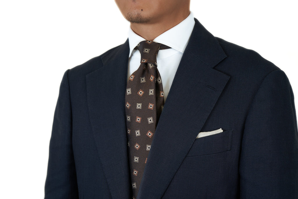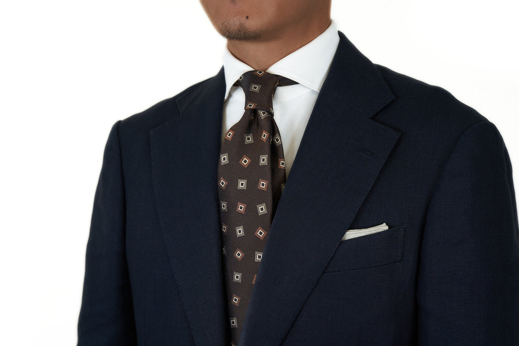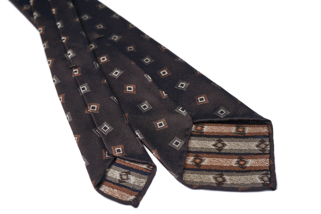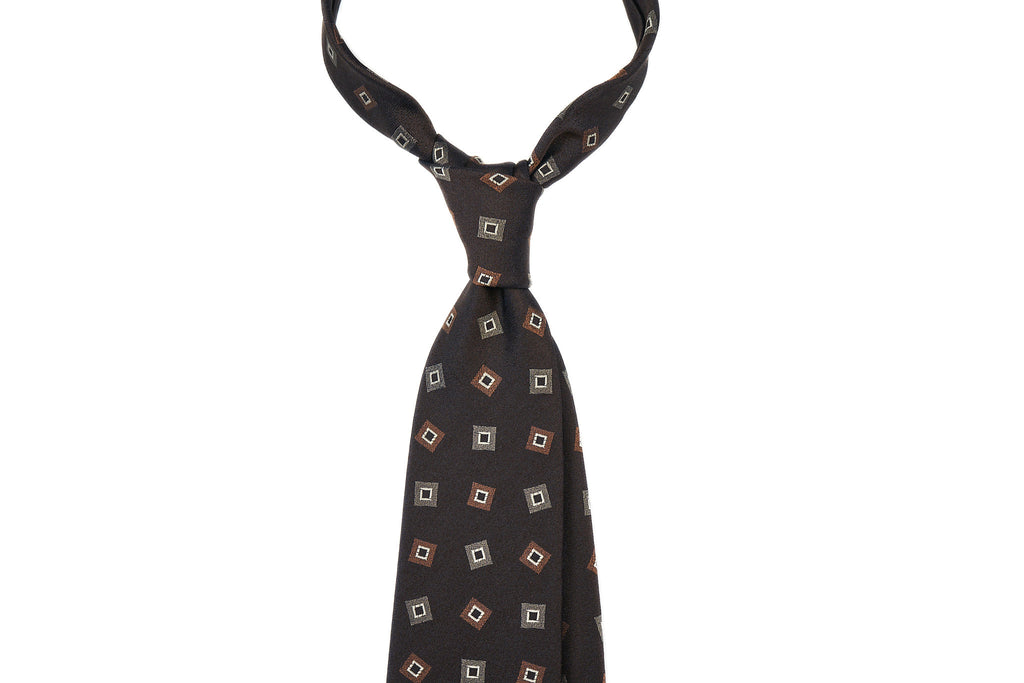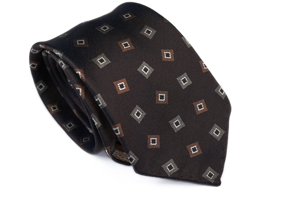 Made of pure woven silk in Japan, this jacquard silk necktie features simple geometric designs on a rich crystal weave ground. The deep chocolate ground is interwoven with navy yarns, and can appear darker or lighter as it catches the light at varying angles, creating additional visual depth.