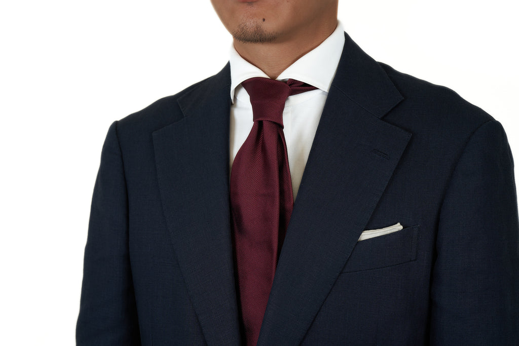 Made of pure woven silk that was woven slowly on old shuttle looms in Kyoto, this repp silk feels richer, fuller and has more structure than most others we have handled. The name repp references the repetitive ribbed weave, and the dense structure and stiffness of this fabric allows you to sculpt your knot and form a beautiful arch that stays put.
